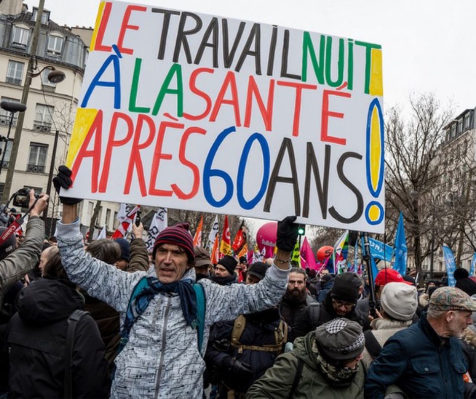 Imagen principal: Foto de las protestas en Francia por la reforma previsional en marcha. La inscripción en el carte dice «El trabajo daña la salud a partir de los 60 años».